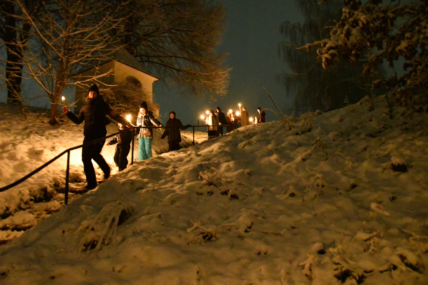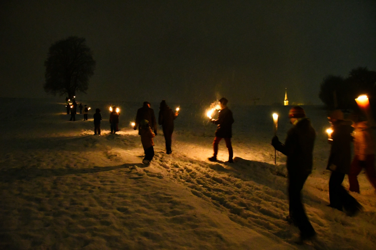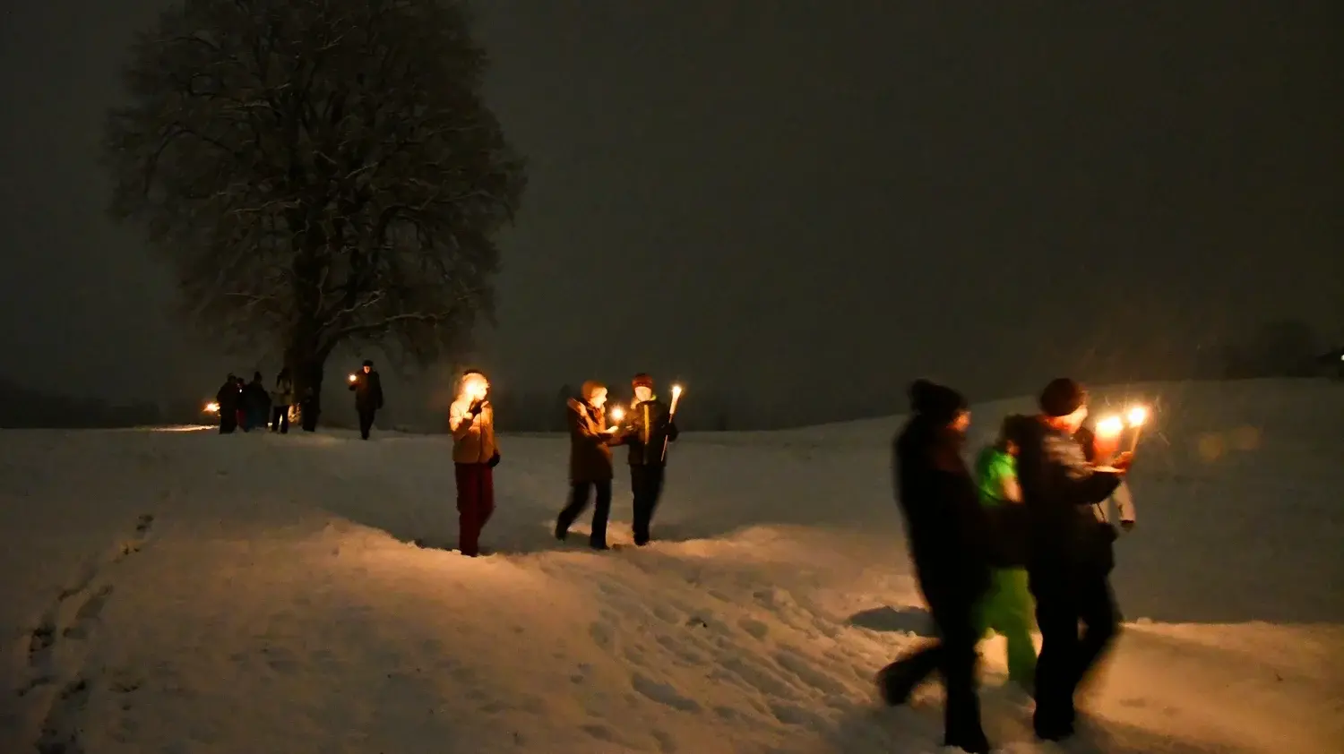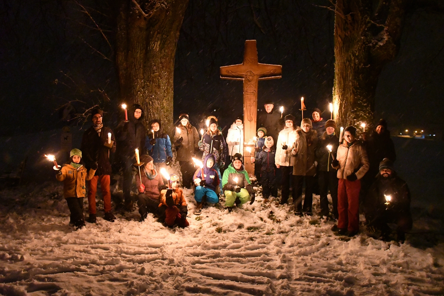 Wie schon im Vorjahr trafen sich die Neumarkter Ministranten in der Adventszeit zu einer stimmungsvollen Fackel-wanderung. Begleitet wurden sie unter anderem von unserem Pfarrer Gottfried Laireiter, Pastoralassistentin Manuela Ebner und dem restlichen Mini Team. Am Vorabend zum 3. Adventsonntag ging es vom Sighartsteiner Weiher aus über Sägewerk und Hagingbauern zum Pfarrhof. Ein außergewöhnliches Glück war, dass sich die Landschaft an genau diesem Tag in frisches Weiß gehüllt hatte, und der Fackelzug im dichten Schneetreiben eine ganz besonders schöne Stimmung bekam. Die Kinder waren mit viel Freude und Energie dabei und auch der eine oder andere Schneeball fand sein Ziel. Für Abwechslung am Weg sorgte außerdem ein kurzer Fackeltanz und ein Gebet am Hagingbauerkreuz. Im Pfarrhof kehrten die Ministranten schließlich ein und wurden von warmen Getränken und einer stärkenden Jause erwartet. Alles in allem war es eine wunderbare Einstimmung auf Weihnachten und Winter.