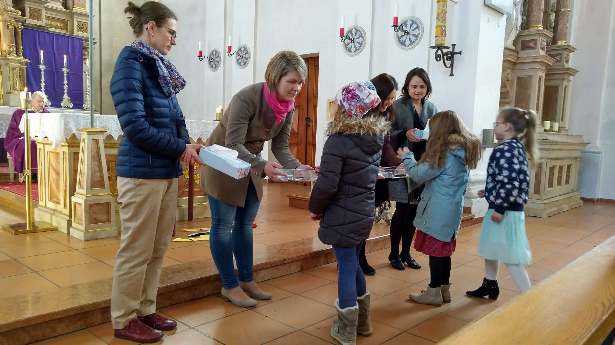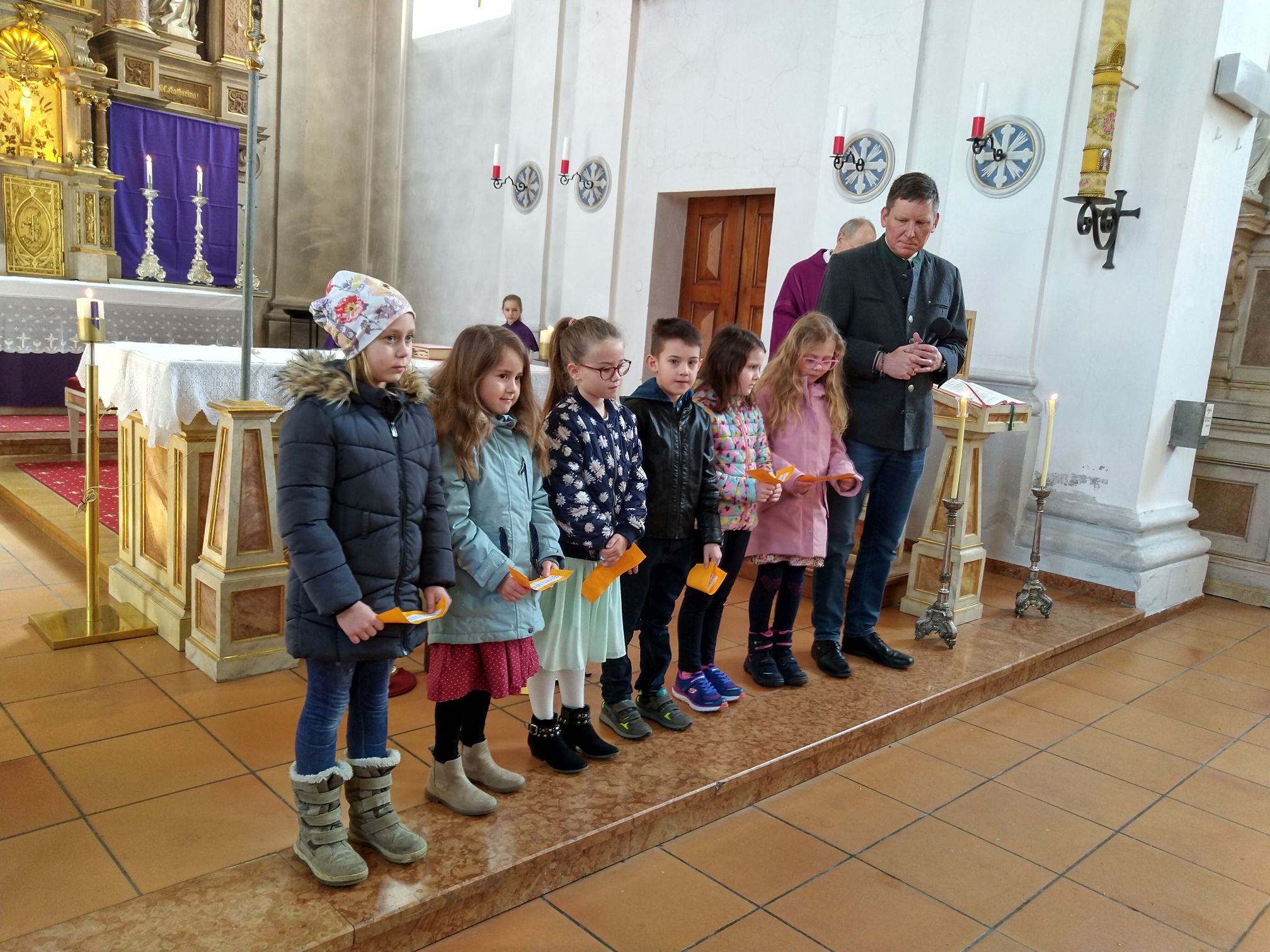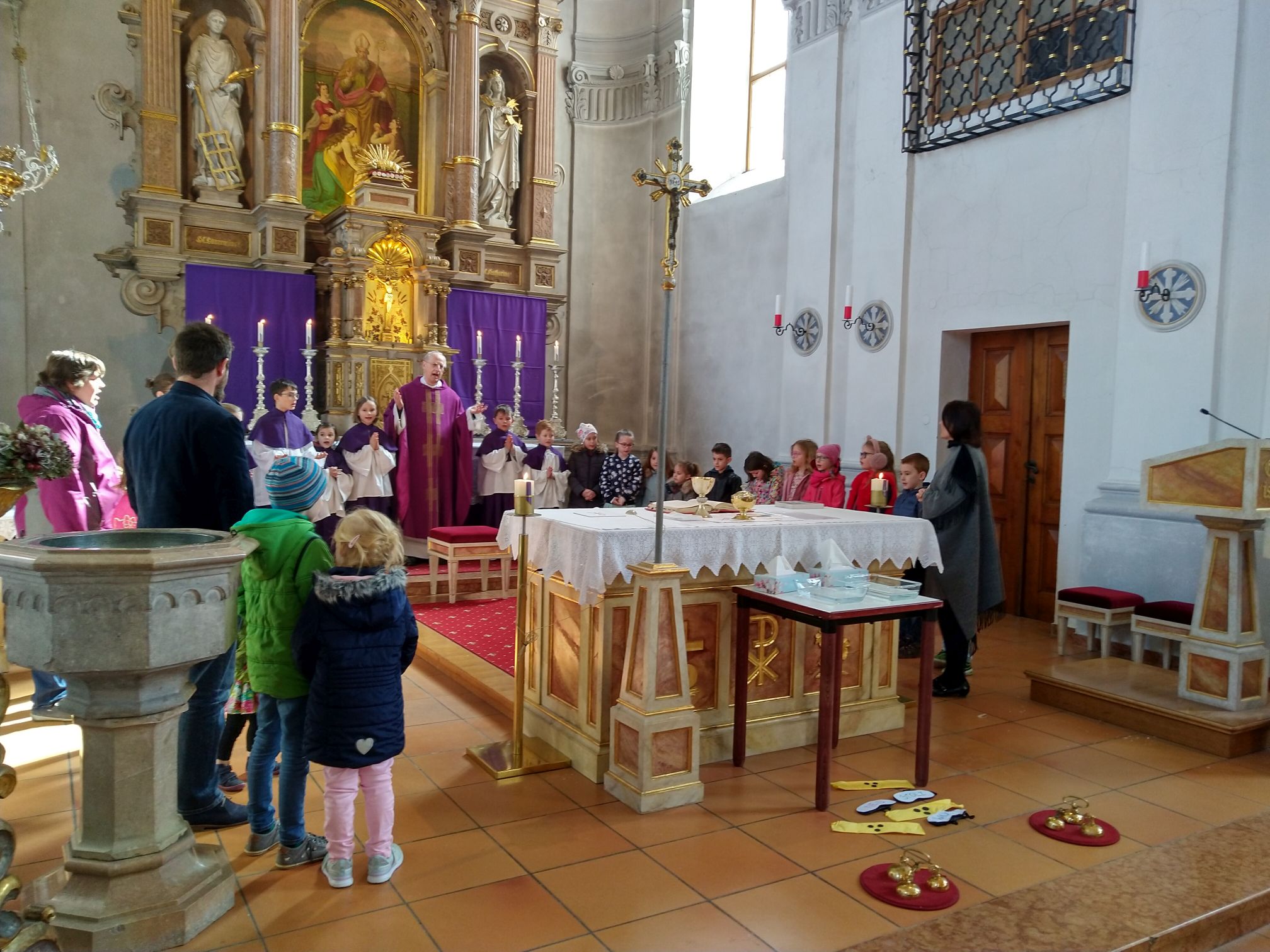 Die Kinder der zweiten Volksschulklassen unterstützten das Junge Kirche Team beim Familiengottesdienst am 4. Fasten-sonntag. Zu Beginn zogen sie begleitet von folgenden Kyrietexten mit Blindenschleife und Augenbinde in die Kirche ein: Wut kann uns blind machen, so blind, dass wir nur noch schreien und zuschlagen. Neid kann uns blind machen, so blind, dass wir nur noch sehen, was andere haben. Stolz kann uns blind machen, so blind, dass wir nur noch uns sehen und die Kleinen und Schwachen nicht. Im Evangelium hörten wir Jesu Heilung eines blind geborenen Mannes. Auch wir wollten „unsere“ Blindheit, das was uns blockiert, vor Gott tragen. Er öffnet uns die Augen und nimmt uns die Last ab. Symbolisch wuschen wir unsere Augen mit Wasser ab. Anschließend fanden sich die Familien zur Agape vor dem Haus St. Katharina ein. Danke an alle Beteiligten für die schöne Feier!